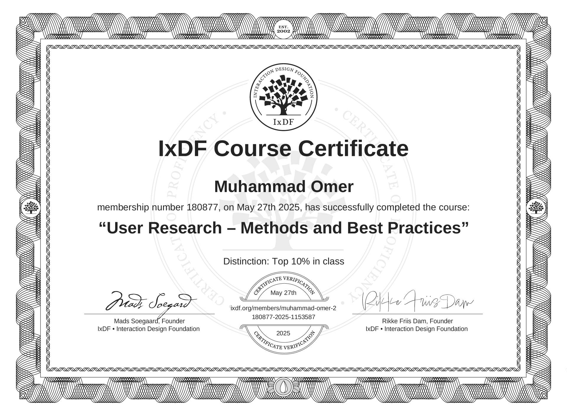 The IxDF Course Certificate above is awarded to Muhammad Omer with a Top 10% Distinction in formal recognition of their coursework surpassing the rigorous benchmarks of exceptional performance established by the IxDF Educational Codex.
