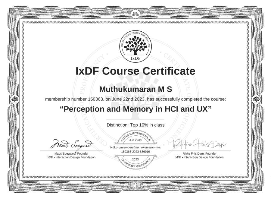 Muthukumaran M S's IxDF Course Certificate: Perception and Memory in HCI and UX