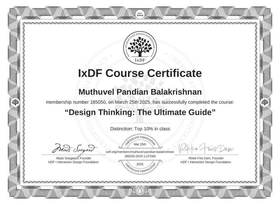 The IxDF Course Certificate above is awarded to Muthuvel Pandian Balakrishnan with a Top 10% Distinction in formal recognition of their coursework surpassing the rigorous benchmarks of exceptional performance established by the IxDF Educational Codex.