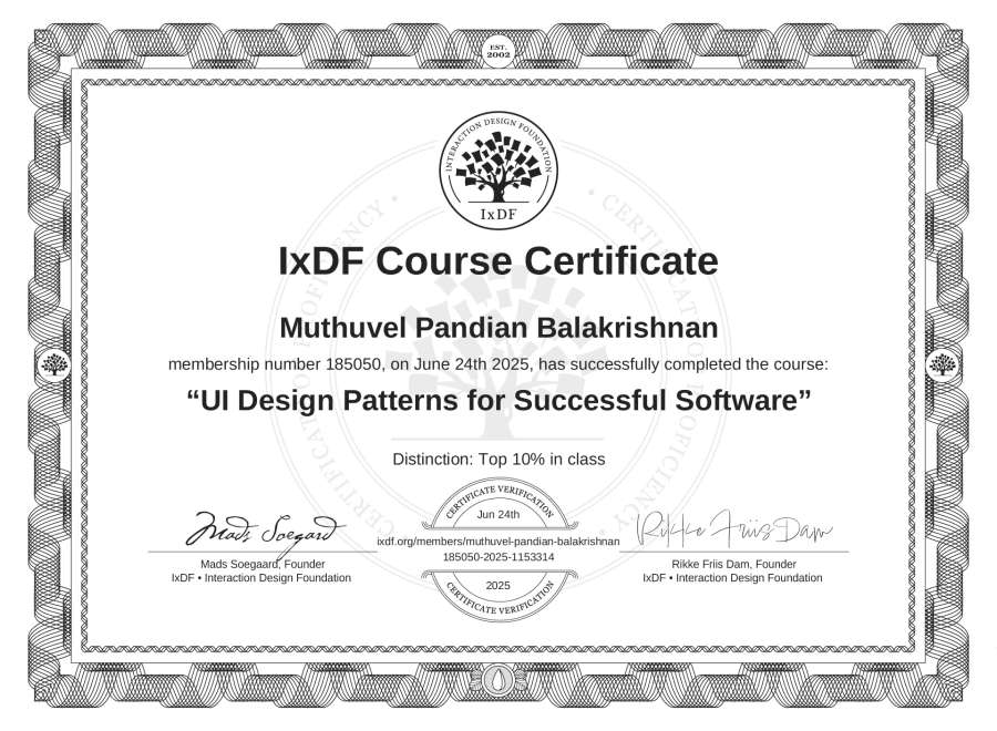 Muthuvel Pandian Balakrishnan's IxDF Course Certificate: UI Design Patterns for Successful Software