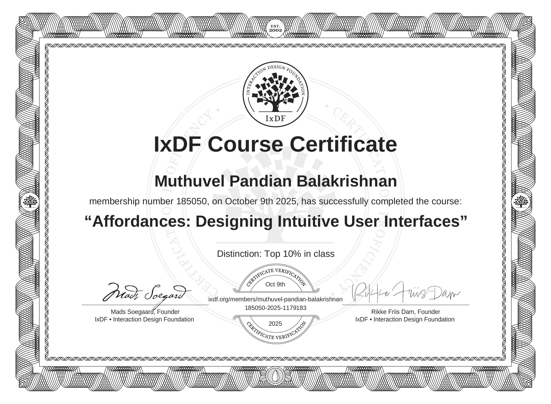 The IxDF Course Certificate above is awarded to Muthuvel Pandian Balakrishnan with a Top 10% Distinction in formal recognition of their coursework surpassing the rigorous benchmarks of exceptional performance established by the IxDF Educational Codex.