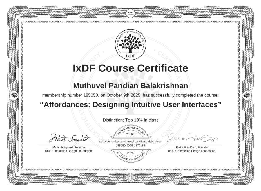 Muthuvel Pandian Balakrishnan's IxDF Course Certificate: Affordances: Designing Intuitive User Interfaces