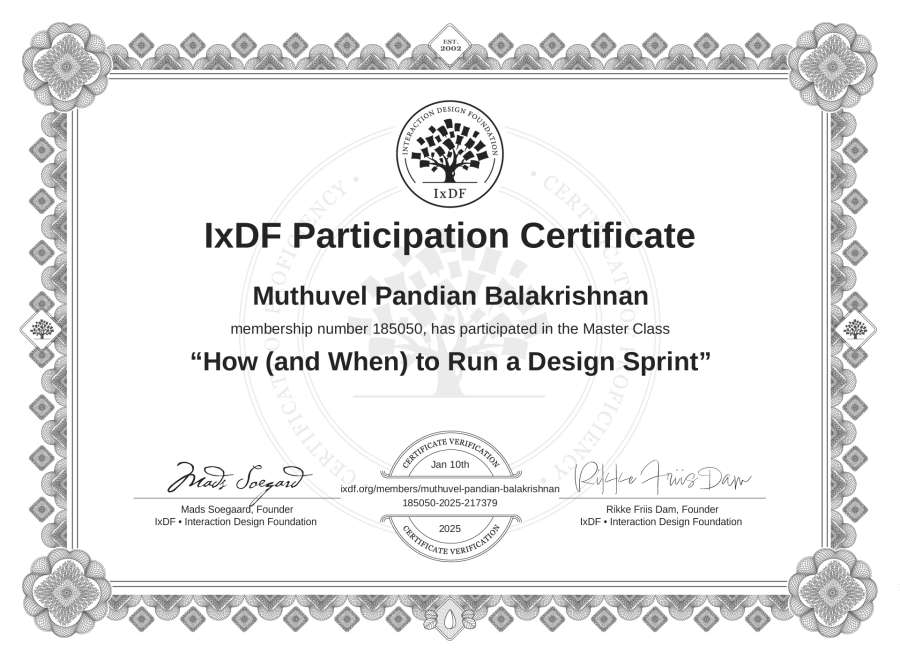 Muthuvel Pandian Balakrishnan's IxDF Masterclass Certificate: How (and When) to Run a Design Sprint