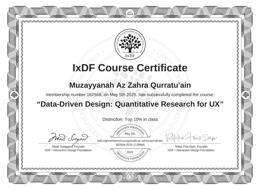 Muzayyanah Az Zahra Qurratu'ain's IxDF Course Certificate: Data-Driven Design: Quantitative Research for UX