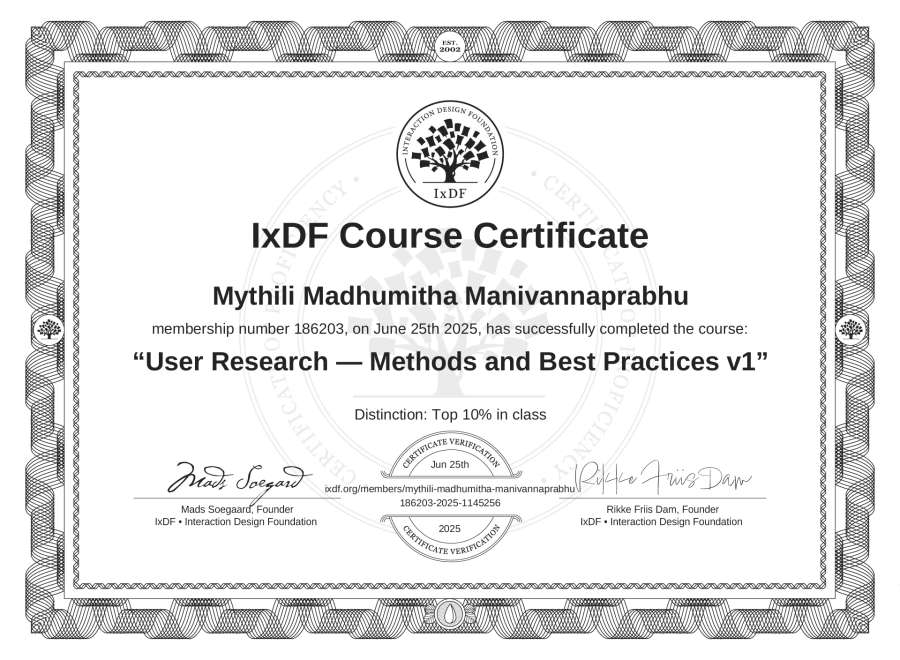 Mythili Madhumitha Manivannaprabhu's IxDF Course Certificate: User Research — Methods and Best Practices v1