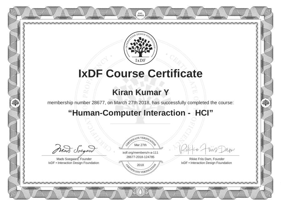 Kiran Kumar Y's IxDF Course Certificate: Human-Computer Interaction - HCI