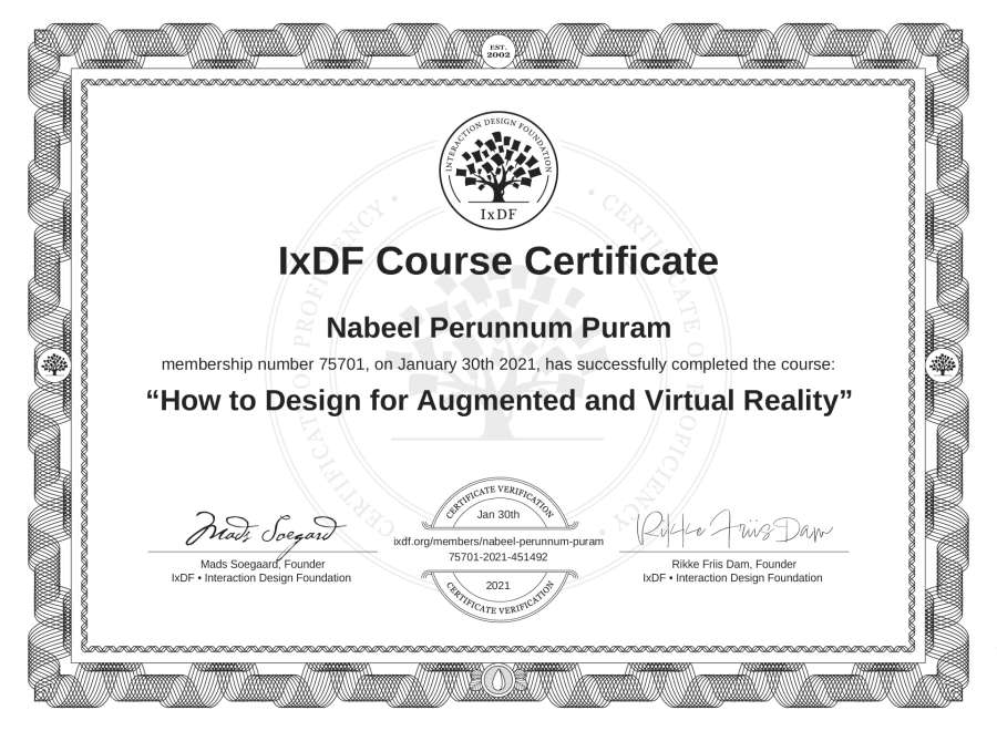 Nabeel Perunnum Puram's IxDF Course Certificate: How to Design for Augmented and Virtual Reality