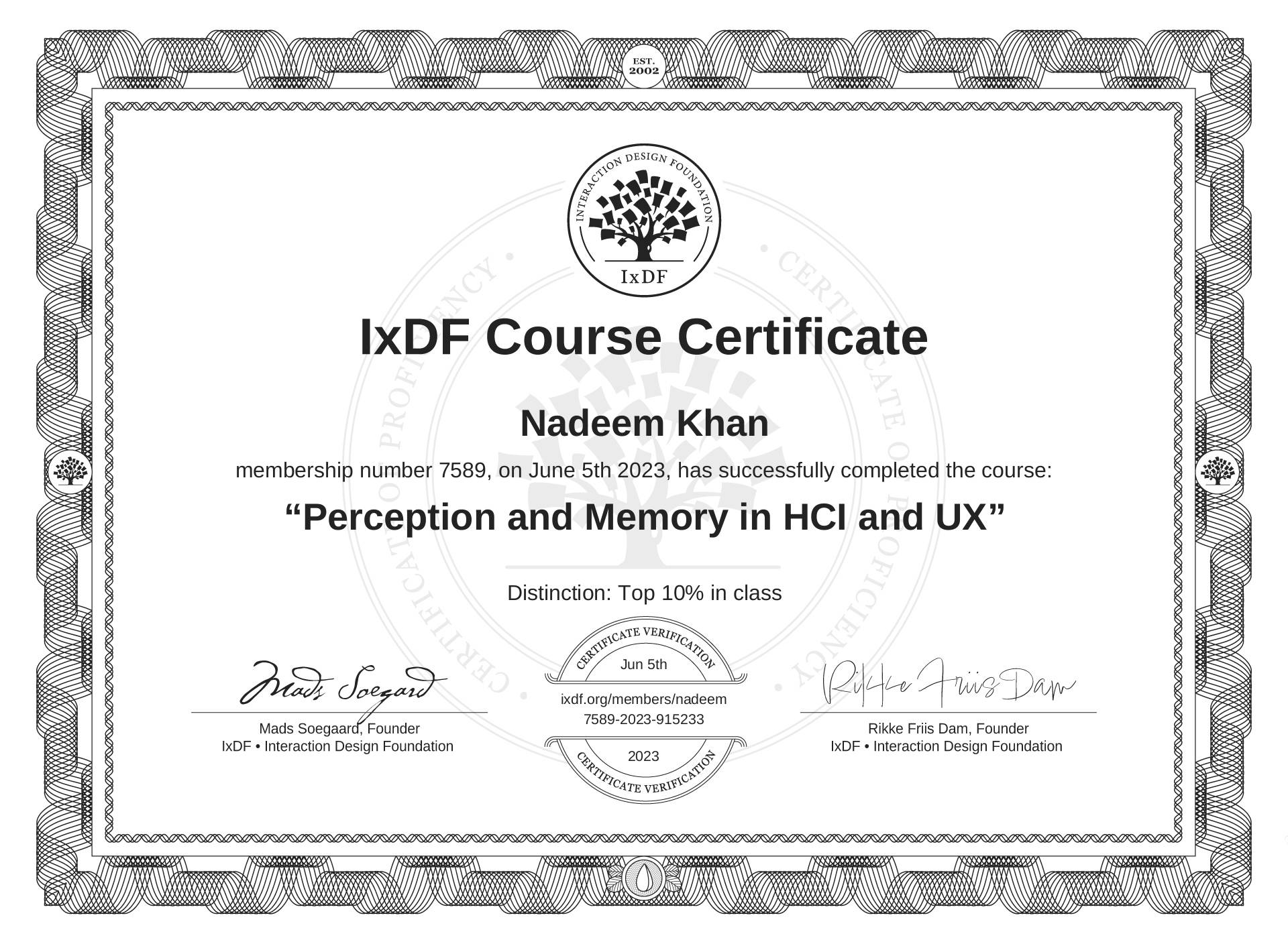 Nadeem Khan's IxDF Course Certificate: Perception and Memory in HCI and UX
