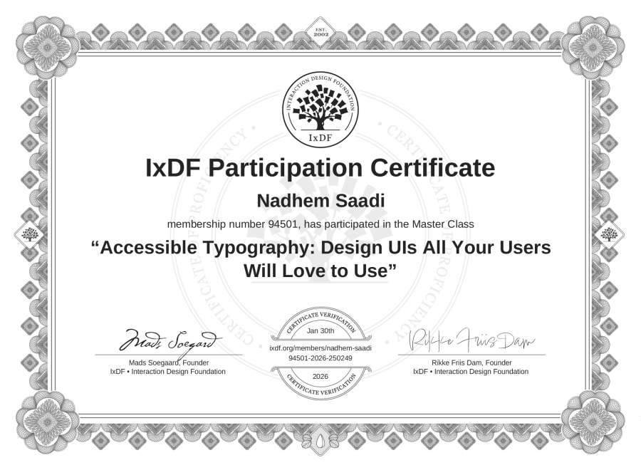 Nadhem Saadi's IxDF Masterclass Certificate: Accessible Typography: Design UIs All Your Users Will Love to Use