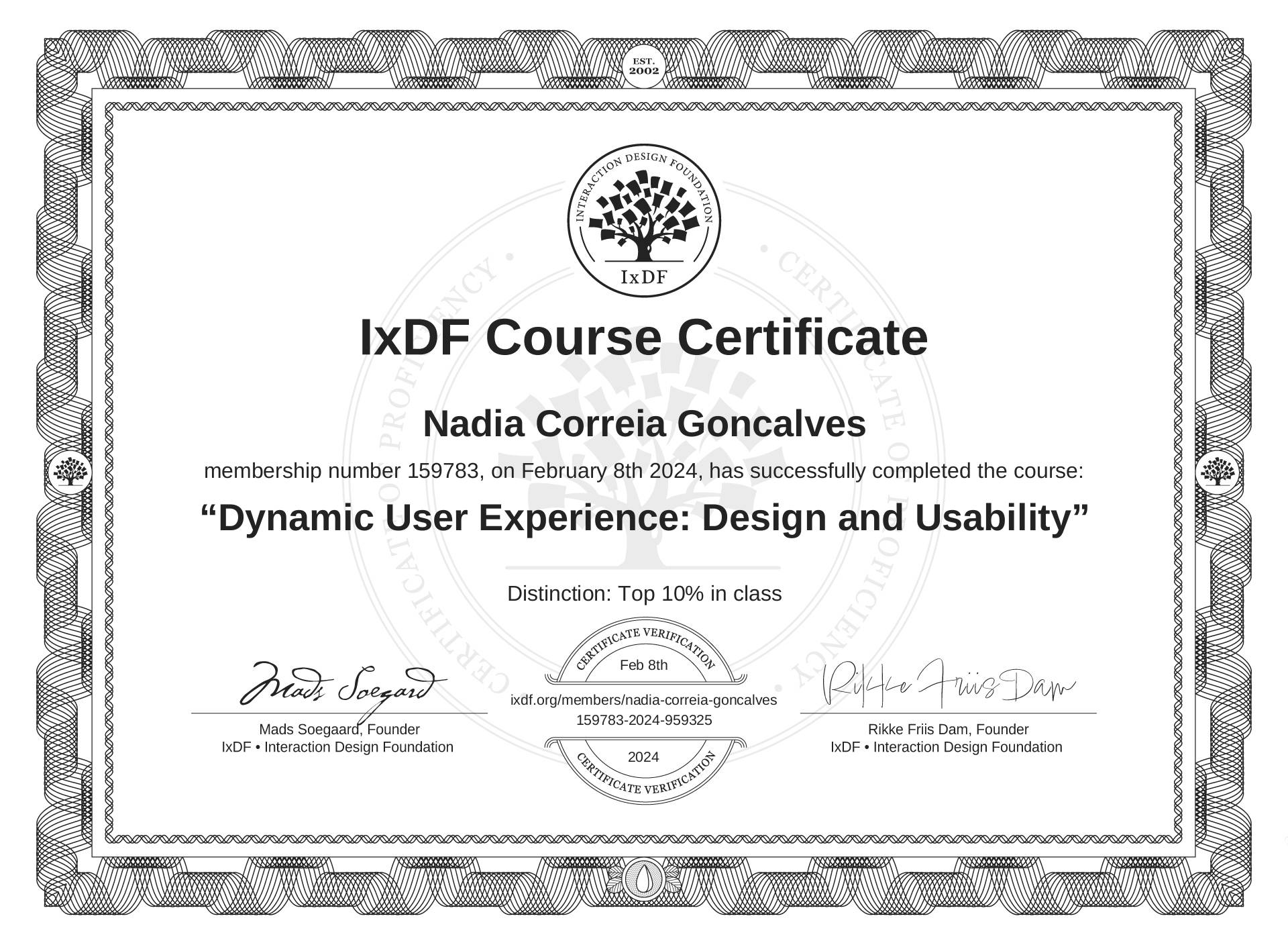 The IxDF Course Certificate above is awarded to Nádia Correia Gonçalves with a Top 10% Distinction in formal recognition of their coursework surpassing the rigorous benchmarks of exceptional performance established by the IxDF Educational Codex.