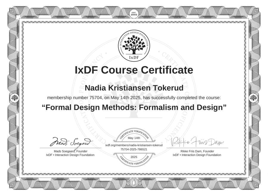 Nadia Kristiansen Tokerud's IxDF Course Certificate: Formal Design Methods: Formalism and Design