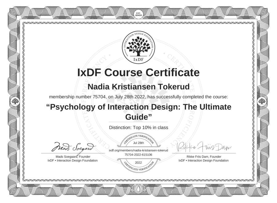 Nadia Kristiansen Tokerud's IxDF Course Certificate: Psychology of Interaction Design: The Ultimate Guide