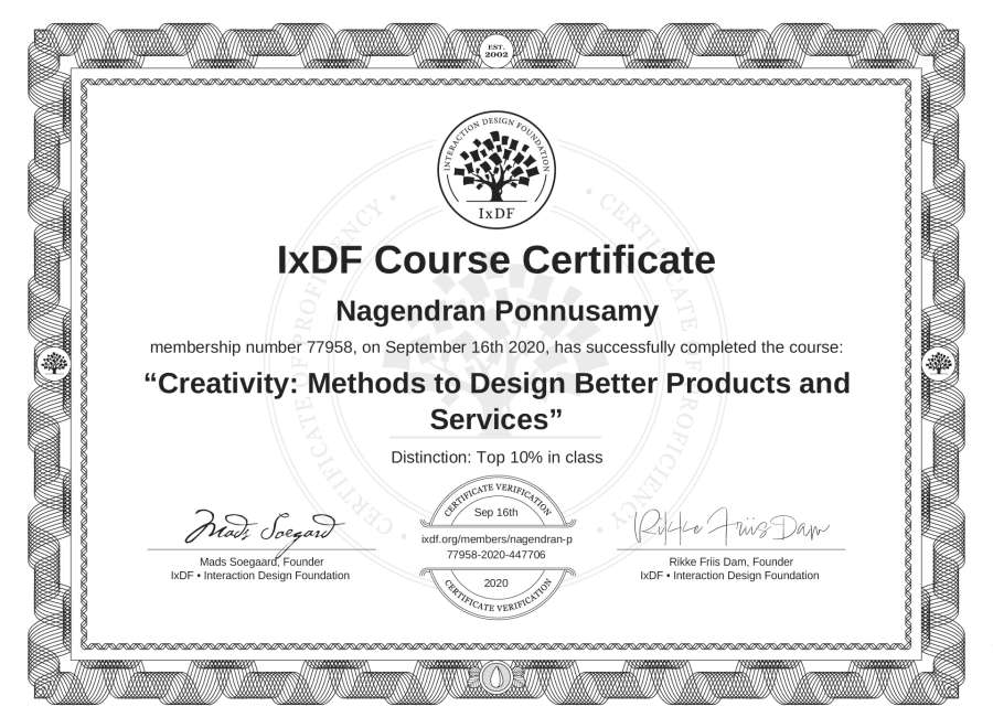 Nagendran Ponnusamy's IxDF Course Certificate: Creativity: Methods to Design Better Products and Services