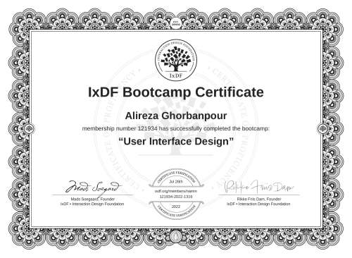 This IxDF Membership Certificate is issued to Alireza Ghorbanpour in formal recognition of their membership of the IxDF, global leader in design education.
