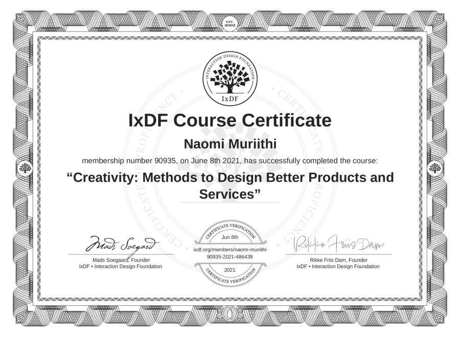 Naomi Muriithi's IxDF Course Certificate: Creativity: Methods to Design Better Products and Services