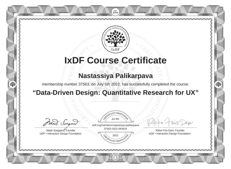 Nastassiya Palikarpava's IxDF Course Certificate: Data-Driven Design: Quantitative Research for UX