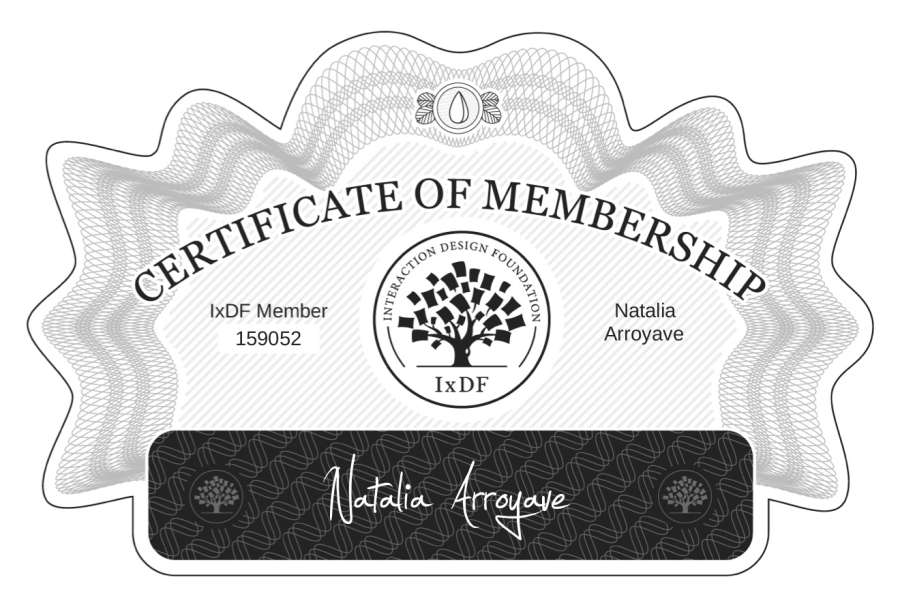 The Membership Certificate below verifies that Natalia Arroyave is a member of Interaction Design Foundation.