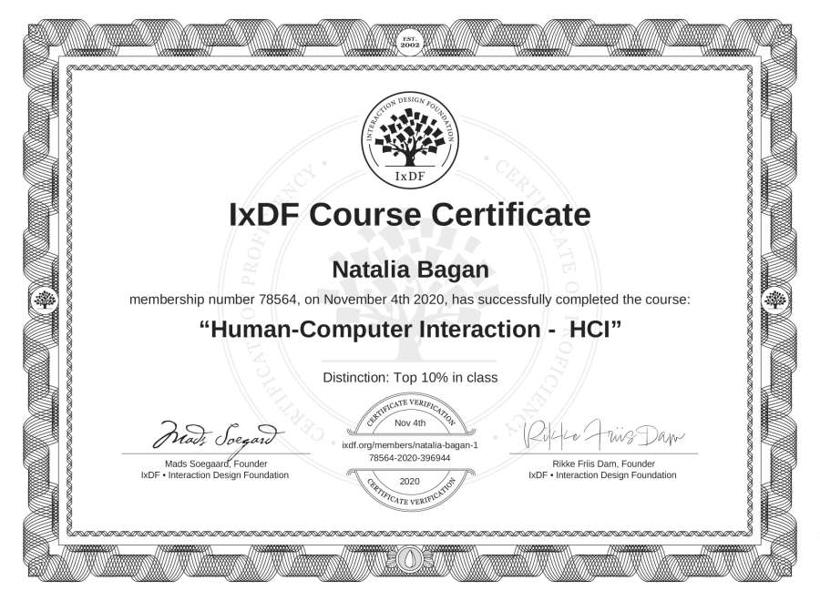 The IxDF Course Certificate above is awarded to Natalia Bagan with a Top 10% Distinction in formal recognition of their coursework surpassing the rigorous benchmarks of exceptional performance established by the IxDF Educational Codex.