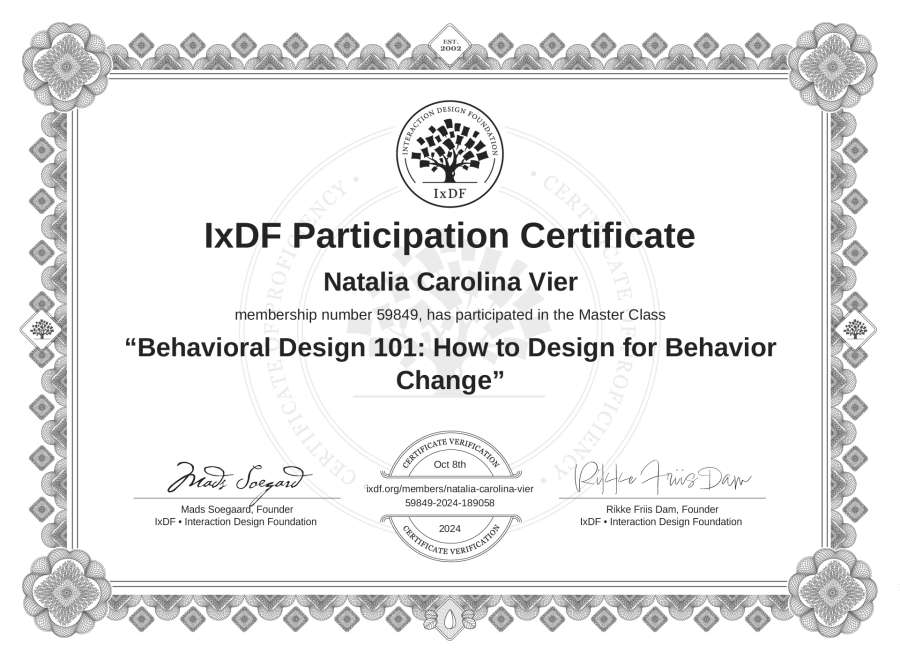 Natalia Carolina Vier's IxDF Masterclass Certificate: Behavioral Design 101: How to Design for Behavior Change