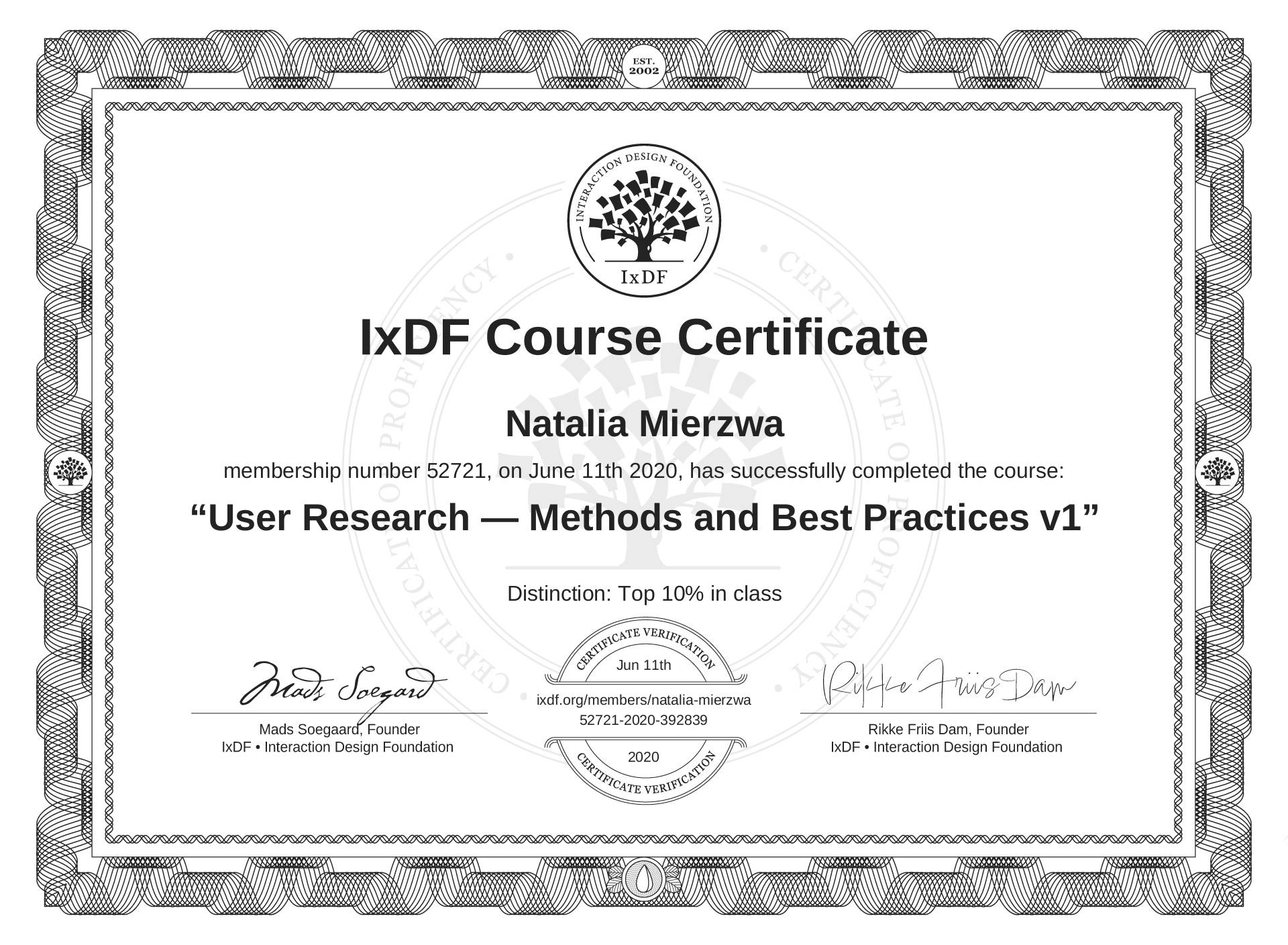 The IxDF Course Certificate above is awarded to Natalia Mierzwa with a Top 10% Distinction in formal recognition of their coursework surpassing the rigorous benchmarks of exceptional performance established by the IxDF Educational Codex.