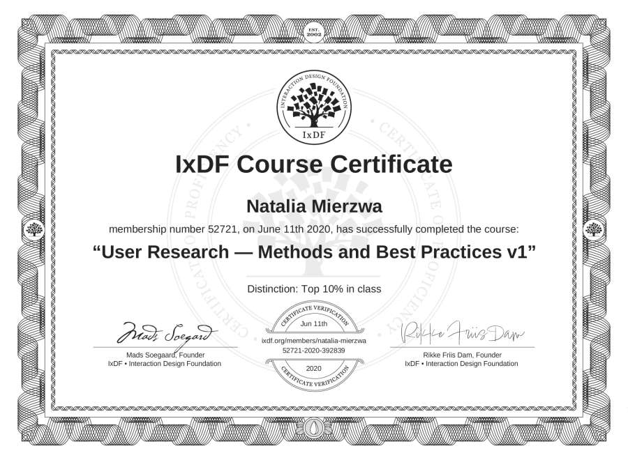 Natalia Mierzwa's IxDF Course Certificate: User Research — Methods and Best Practices v1