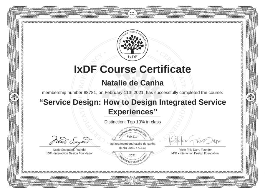 Natalie de Canha's IxDF Course Certificate: Service Design: How to Design Integrated Service Experiences