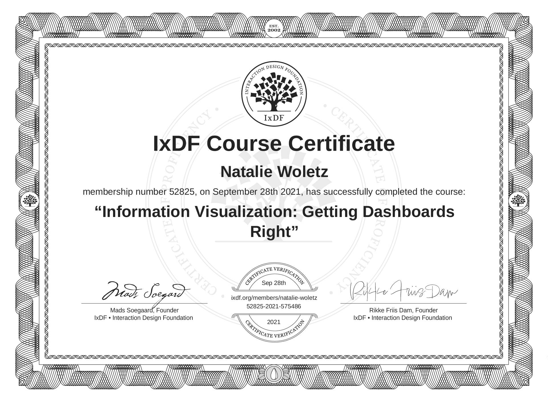 Natalie Woletz's IxDF Course Certificate: Information Visualization: Getting Dashboards Right