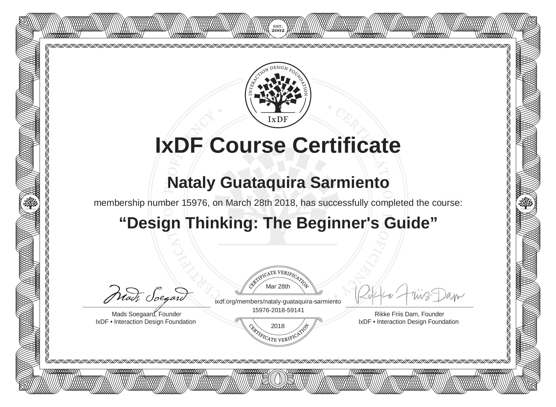Nataly Guataquira Sarmiento's IxDF Course Certificate: Design Thinking: The Beginner's Guide