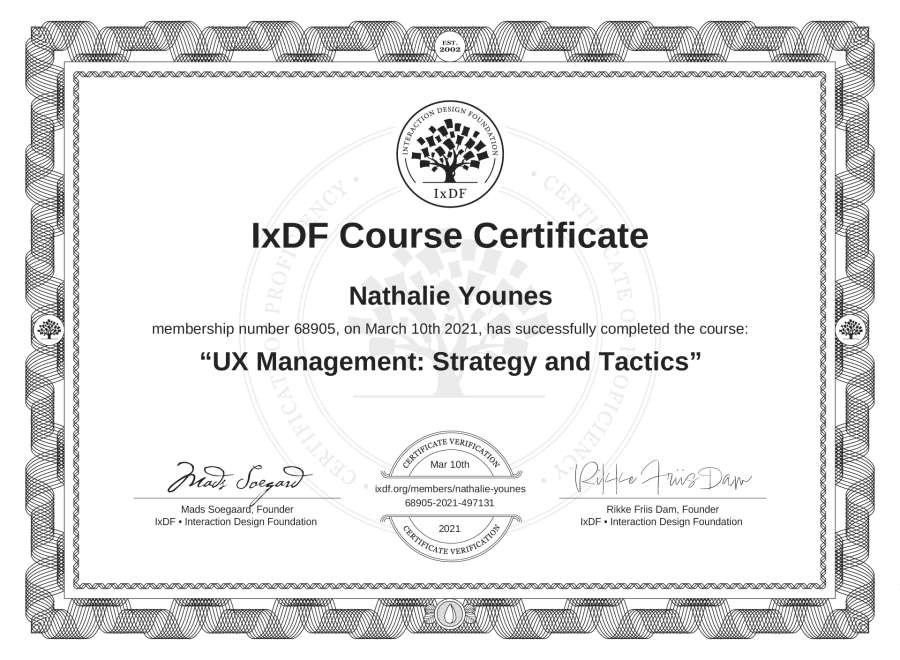 Nathalie Younes's IxDF Course Certificate: UX Management: Strategy and Tactics