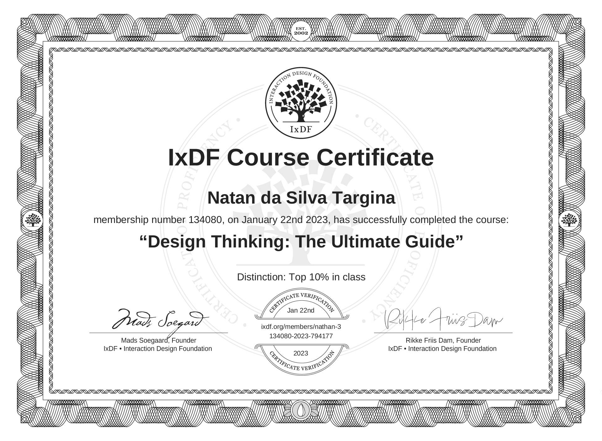 The IxDF Course Certificate above is awarded to Natan da Silva Targina with a Top 10% Distinction in formal recognition of their coursework surpassing the rigorous benchmarks of exceptional performance established by the IxDF Educational Codex.