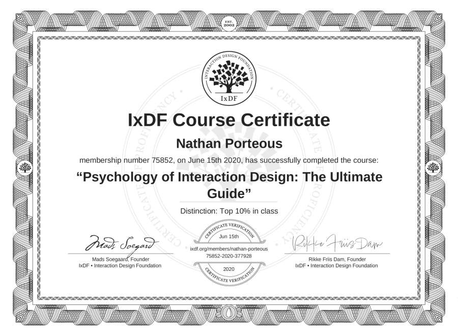 Nathan Porteous's IxDF Course Certificate: Psychology of Interaction Design: The Ultimate Guide