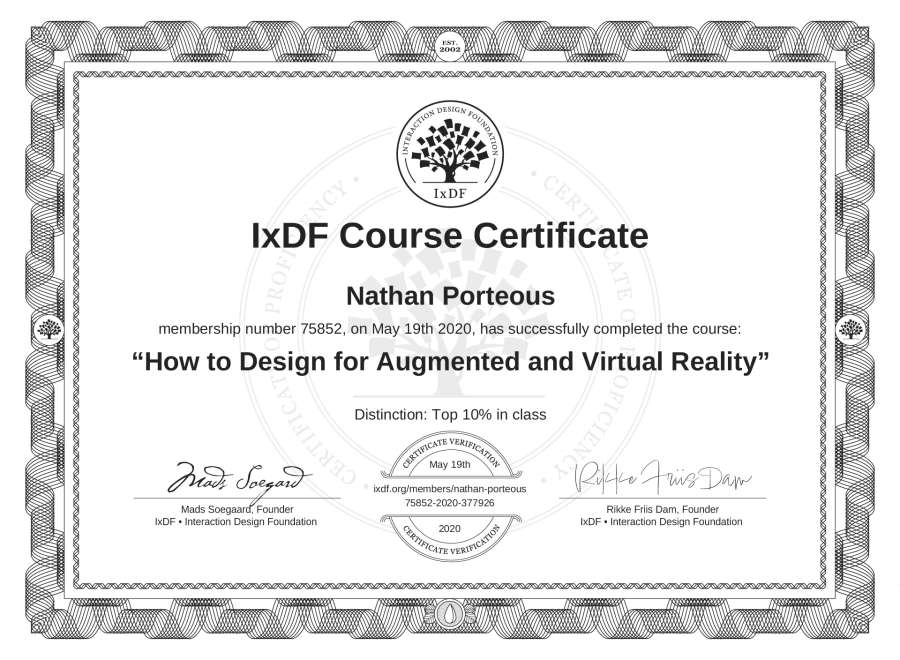 The IxDF Course Certificate above is awarded to Nathan Porteous with a Top 10% Distinction in formal recognition of their coursework surpassing the rigorous benchmarks of exceptional performance established by the IxDF Educational Codex.