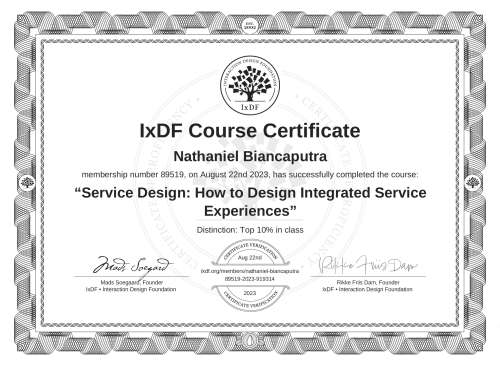 IxDF Course Certificates are awarded to Nathaniel Biancaputra in formal recognition of their coursework surpassing the rigorous benchmarks of exceptional performance established by the IxDF Educational Codex.
