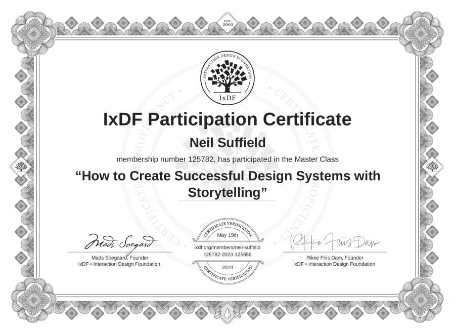 Neil Suffield's IxDF Masterclass Certificate: How to Create Successful Design Systems with Storytelling