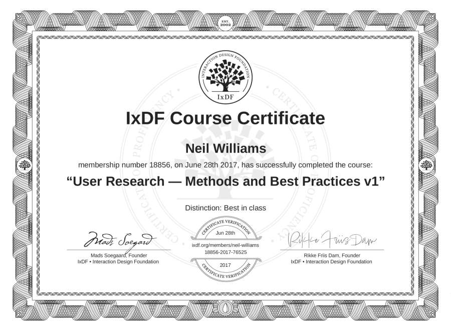 Neil Williams's IxDF Course Certificate: User Research — Methods and Best Practices v1
