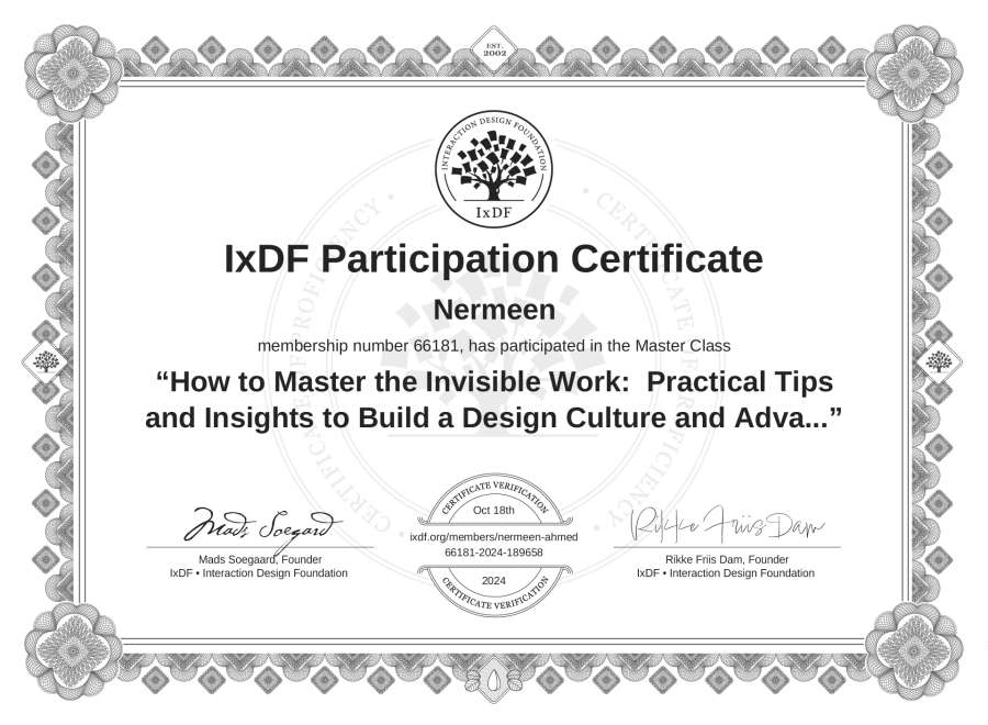 Nermeen's IxDF Masterclass Certificate: How to Master the Invisible Work: Practical Tips and Insights to Build a Design Culture and Advance Your Career