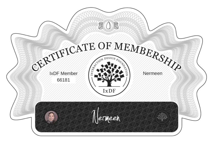 The Membership Certificate below verifies that Nermeen is a member of Interaction Design Foundation.