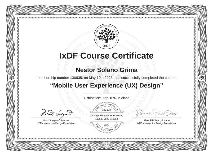 Néstor Solano Grima's IxDF Course Certificate: Mobile User Experience (UX) Design