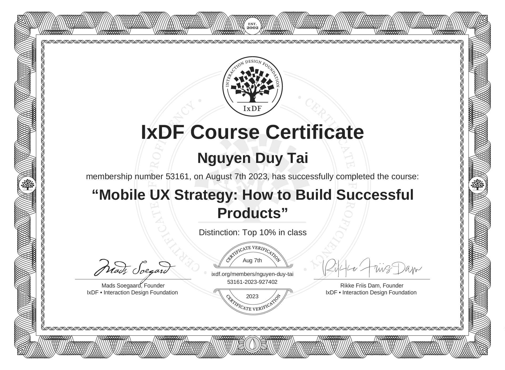 The IxDF Course Certificate above is awarded to Nguyen Duy Tai with a Top 10% Distinction in formal recognition of their coursework surpassing the rigorous benchmarks of exceptional performance established by the IxDF Educational Codex.