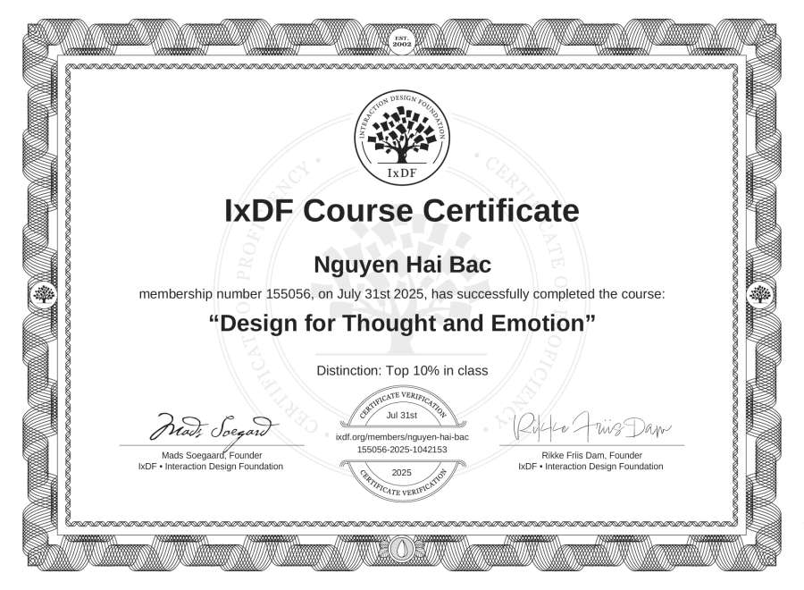 Nguyen Hai Bac's IxDF Course Certificate: Design for Thought and Emotion