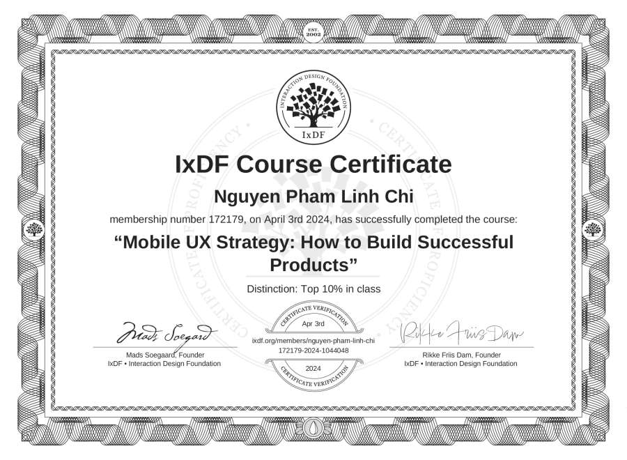 The IxDF Course Certificate above is awarded to Nguyen Pham Linh Chi with a Top 10% Distinction in formal recognition of their coursework surpassing the rigorous benchmarks of exceptional performance established by the IxDF Educational Codex.