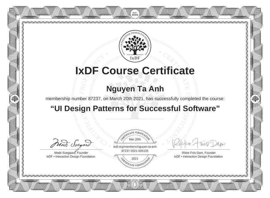 Nguyễn Tá Anh's IxDF Course Certificate: UI Design Patterns for Successful Software