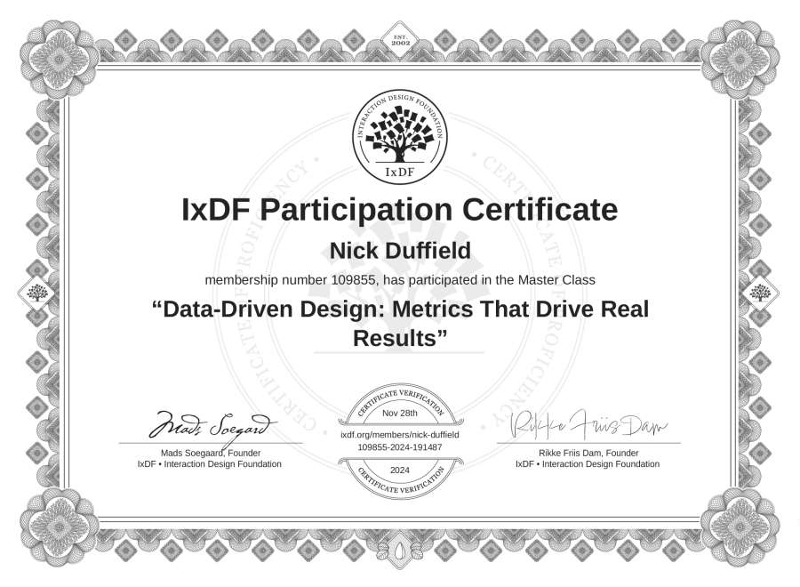 Nick Duffield's IxDF Masterclass Certificate: Data-Driven Design: Metrics That Drive Real Results