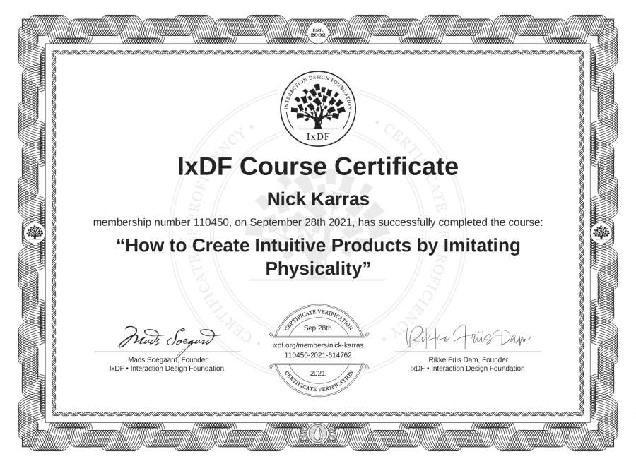 Nick Karras's IxDF Course Certificate: How to Create Intuitive Products by Imitating Physicality