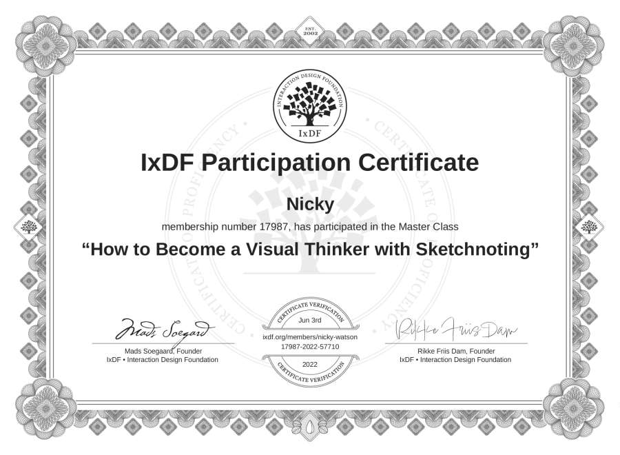 Nicky's IxDF Masterclass Certificate: How to Become a Visual Thinker with Sketchnoting