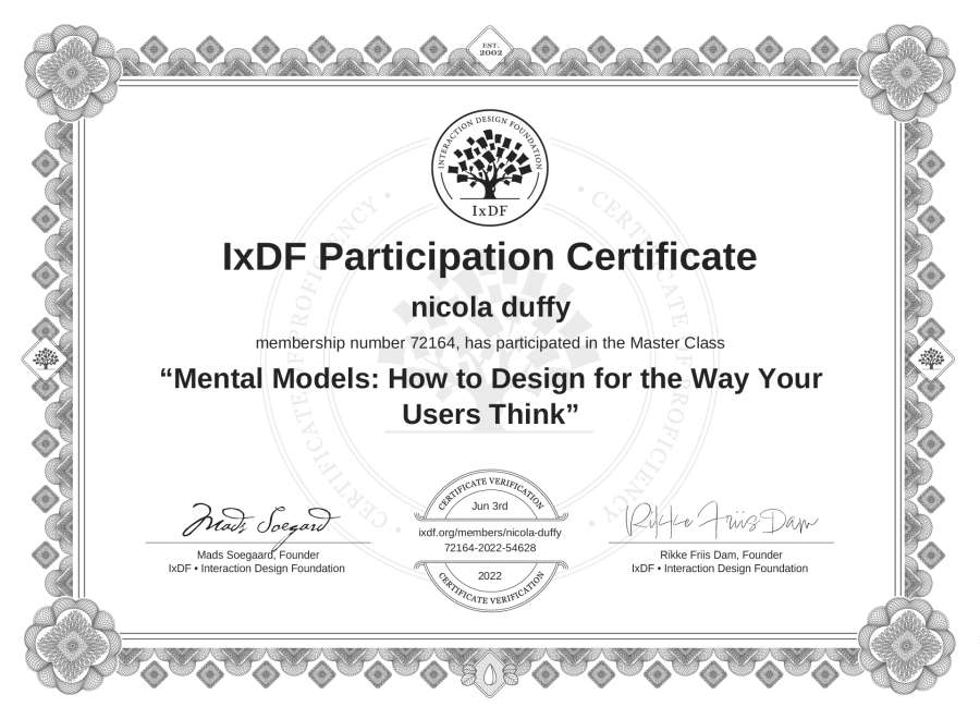 nicola duffy's IxDF Masterclass Certificate: Mental Models: How to Design for the Way Your Users Think