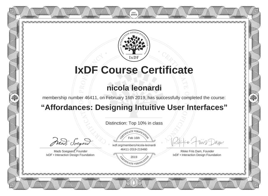 The IxDF Course Certificate above is awarded to nicola leonardi with a Top 10% Distinction in formal recognition of their coursework surpassing the rigorous benchmarks of exceptional performance established by the IxDF Educational Codex.