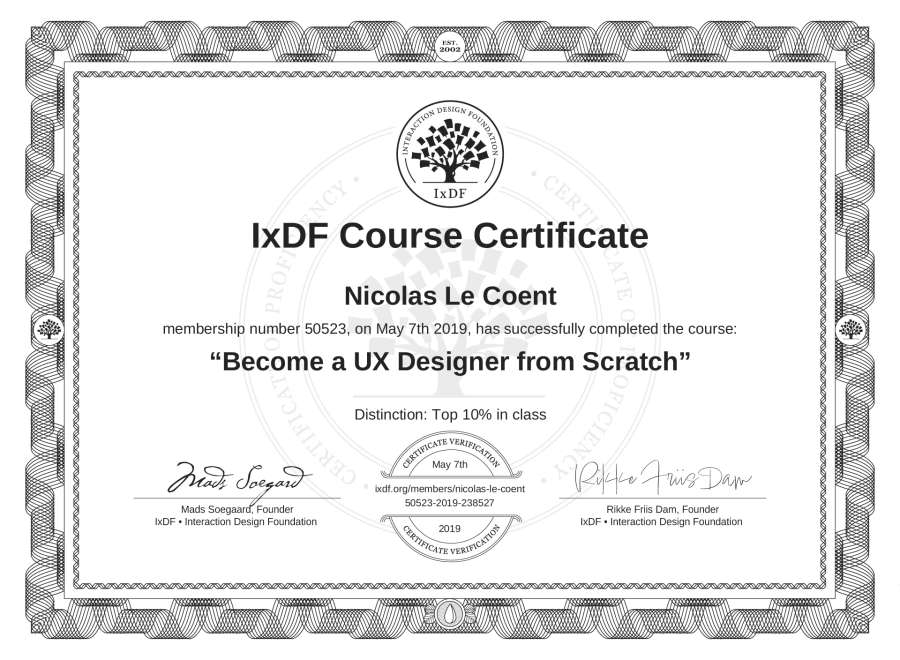 The IxDF Course Certificate above is awarded to Nicolas Le Coent with a Top 10% Distinction in formal recognition of their coursework surpassing the rigorous benchmarks of exceptional performance established by the IxDF Educational Codex.