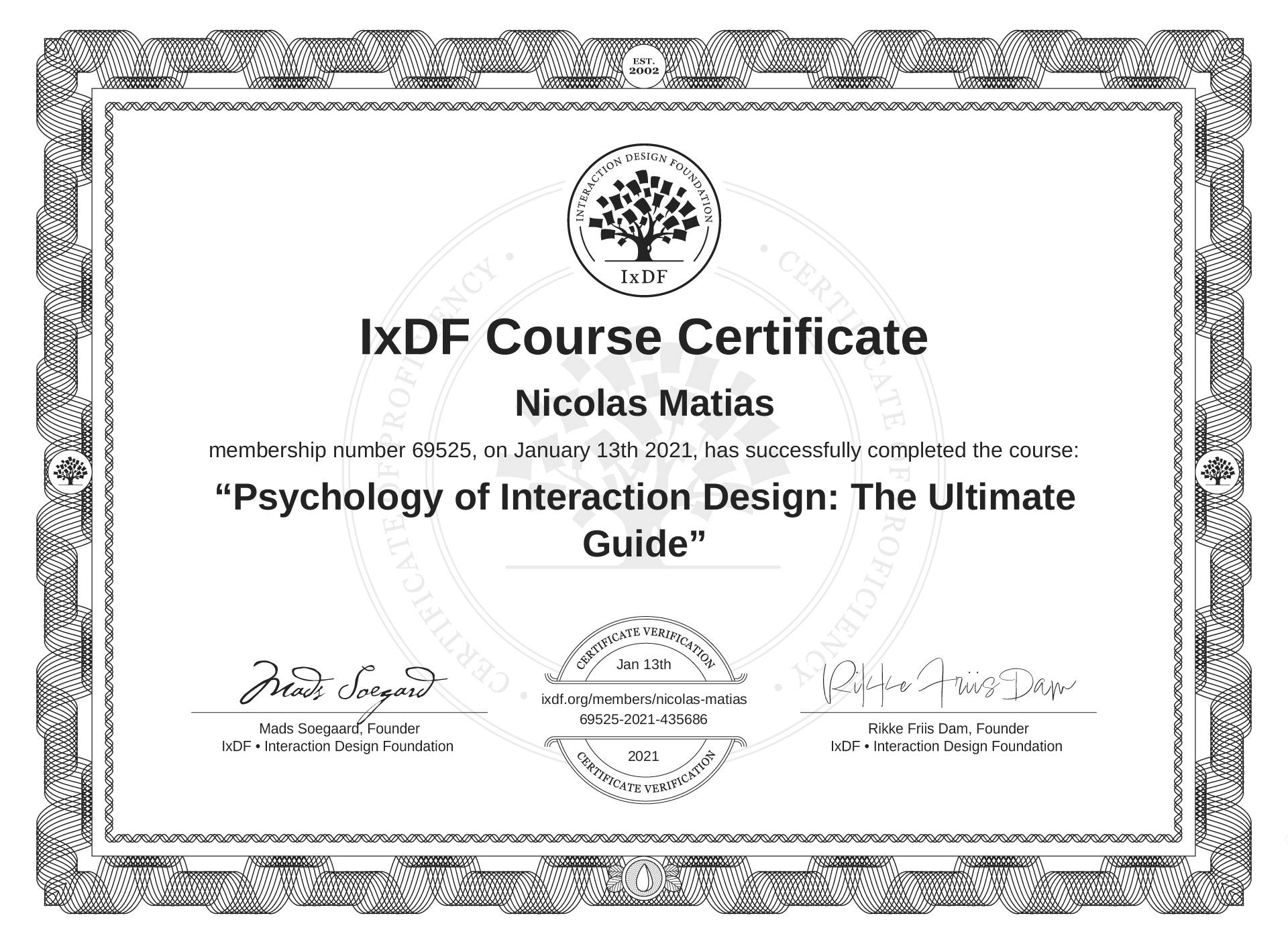 Nicolas Matias's IxDF Course Certificate: Psychology of Interaction Design: The Ultimate Guide