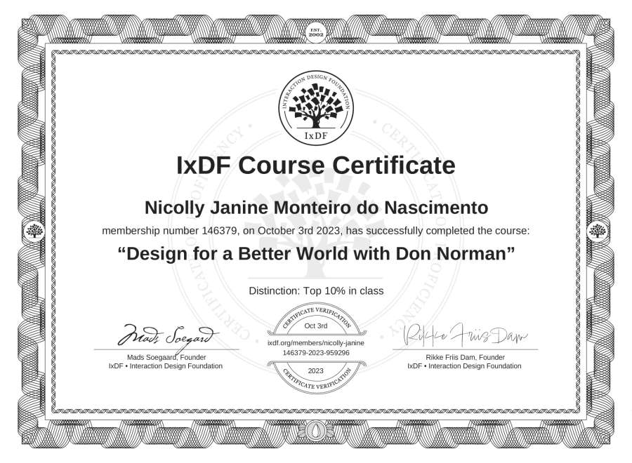 Nicolly Janine Monteiro do Nascimento's IxDF Course Certificate: Design for a Better World with Don Norman